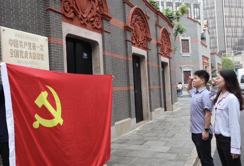 首先,韩建汶、员明绚等同志来到上海中共一大会址前重温入党誓词。100年前的1921年7月,中国共产党第一次全国代表大会在这里举行。毛泽东主席称这里是中国共产党的“产床”,这里也是我们中国共产党人的精神家园。