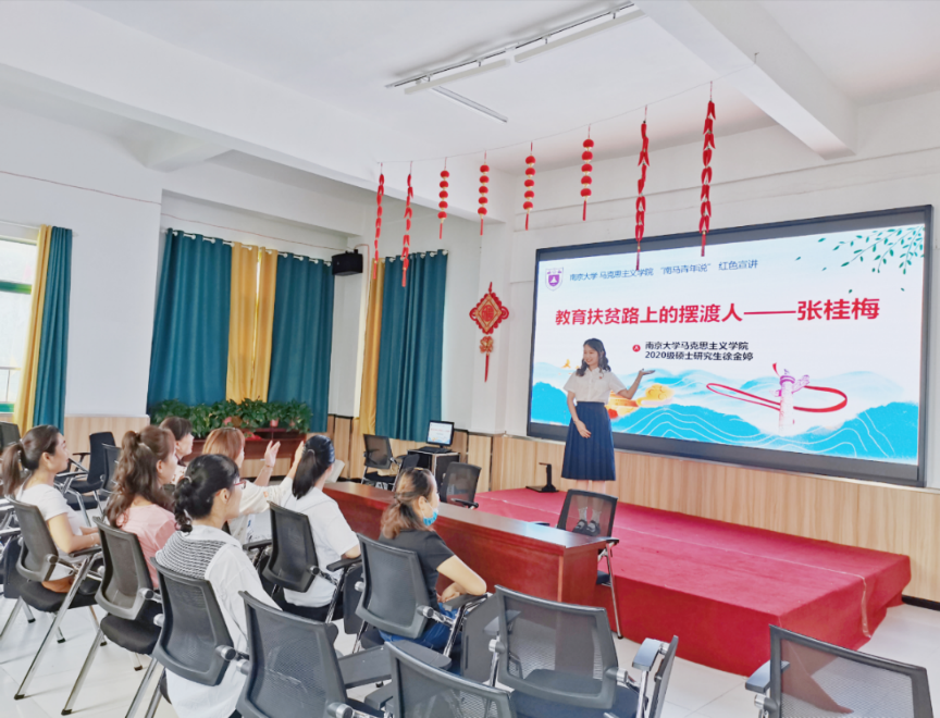 2021年9月3日,徐金婷同学来到杜集区第二幼儿园教师党支部开展“教育扶贫路上的摆渡人——张桂梅”主题宣讲。首先,徐金婷同学向大家宣传国家精准扶贫相关政策,让大家更多更详细地了解我们党和政府在脱贫攻坚方面的政策举措,国家进行产业扶贫、教育扶贫、技能培训、易地搬迁、保障兜底等多管齐下。习近平总书记指出,扶贫必扶智,让贫困地区的孩子接受良好教育,是扶贫开发的重要任务,也是阻断贫困代际传递的重要途径。