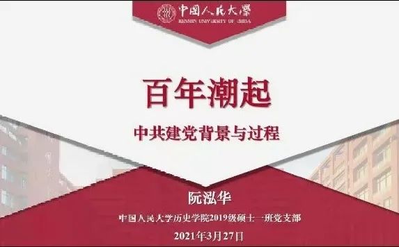 首先,中国人民大学中国近现代史专业阮泓华向大家作《百年潮起——中共建党背景与过程》主题报告。他以时间为脉络,从“大风起兮:建党的国际背景”“追欧揖美?旧邦如何改造”“开天辟地:中国的一九二一”“重审告别革命”四方面展开论述,通过生动的故事与详实的史料系统论述了在民族危亡之际,中国共产党成立的国内外背景与发展过程,使大家深刻认识到中国共产党的成立是时代的选择与历史必然。