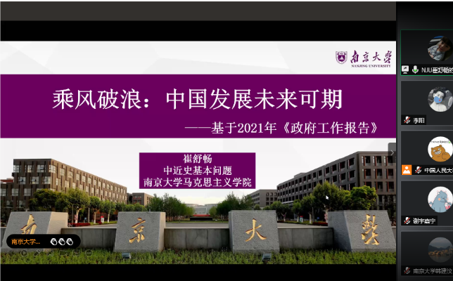 2020级研究生崔舒畅以《乘风破浪:中国发展未来可期》为题向大家作主题报告。他从“关键词看政府工作报告”“数据统计看中国发展”“新阶段、新理念、新格局”三方面为大家简要解读两会精神,通过丰富的图表、精确的数据帮助大家明确了我国当前取得的伟大成就与面临的重大挑战,并鼓励大家要以习近平新时代中国特色社会主义思想为指导,齐心协力,开拓进取,以优异成绩庆祝党的百年华诞。