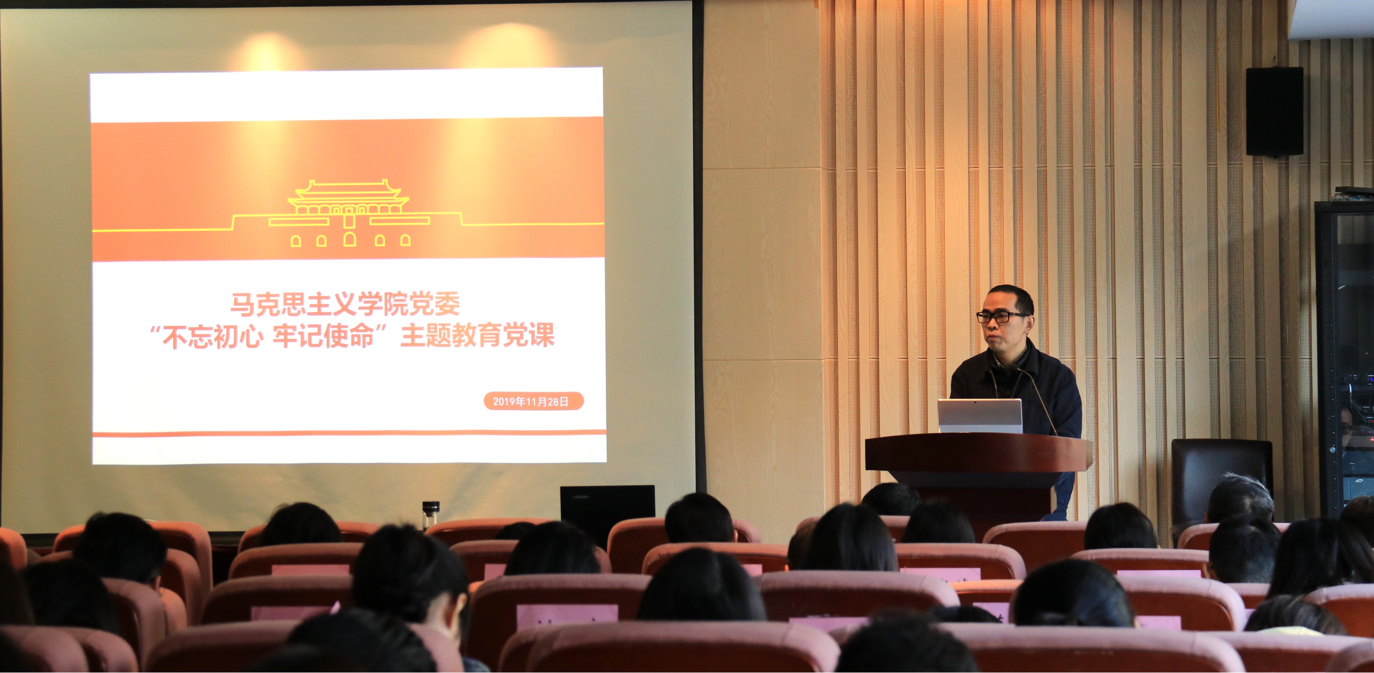 党委书记王建华、院长胡大平在圣达楼101报告厅为师生们讲授了一堂生动的专题党课。全体教职工党员、学生党员参加主题教育党课学习,教职工第一党支部书记张伟主持。