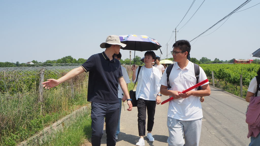 在农业产业基地,南天竹、茭白、小麦等农作物长势喜人,引得同学们驻足观赏。王知逊为同学们细心讲解了各类农作物的生长习性与经济价值,令他颇为自豪的是白塔村果园产业所取得的不斐成绩——五一期间上市的小樱桃火爆一时,正当季的是同学们即将前往采摘的桑葚,之后到7、8月份,水蜜桃、黄桃和魏可红提也将上市,这些都曾获江苏省优质水果大赛金奖和银奖。