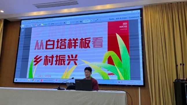 2021级本科生团支部成员蔡恺翔同学以《从白塔样板看乡村振兴》为题展开分享交流。他从白塔村样本引入,从产业兴旺、生态宜居、乡风文明、治理有效和生活富裕五个方面展开对白塔村乡村振兴的路径进行了深入的探究。接着,杏彩体育官网