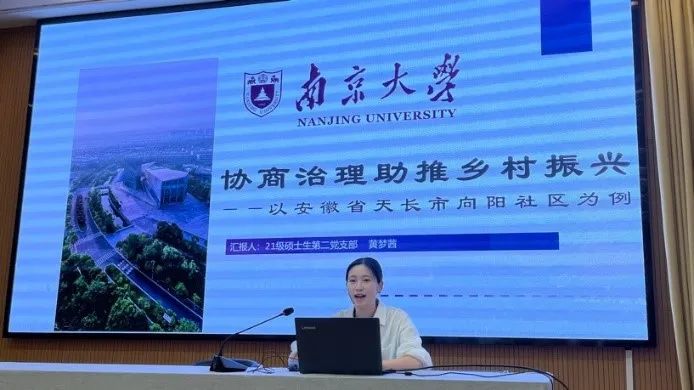 2021级硕士生第二党支部成员黄梦茜同学进行《协商治理助推乡村振兴——以安徽省天长市郑集镇向阳社区为例》的主题宣讲。黄梦茜从我国基层治理的一个社区为案例,通过对该社区协商治理的政策导向、治理模式、取得成效的分析,以小见大地挖掘在我国乡村振兴背景下基层民主制度建设的重要作用。
