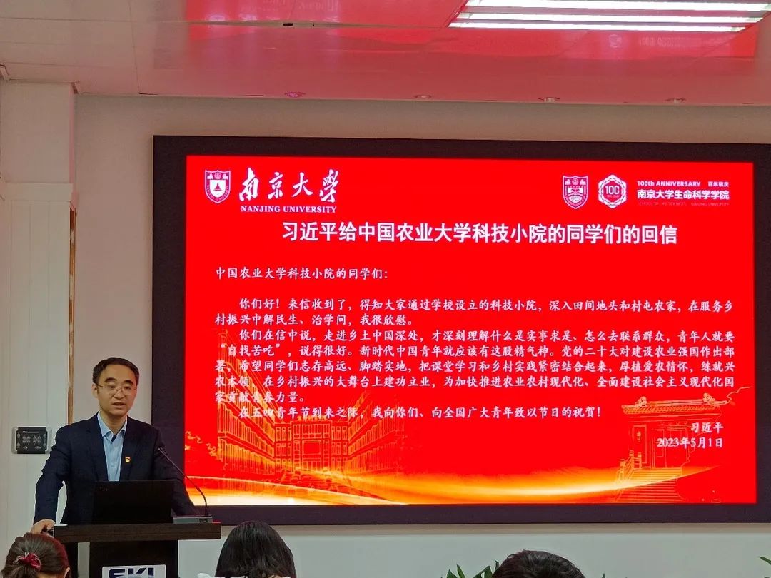 在全党深入开展主题教育的重要时刻,在习近平总书记给南京大学留学归国青年学者重要回信一周年之际,以本次联合主题党日为契机,两院师生党员将牢牢把握“学思想、强党性、重实践、建新功”总要求,牢记习近平总书记嘱托,以“报效祖国、服务人民”为自觉追求,心系“国家事”,肩扛“国家责”,勇于“自找苦吃”,坚持把论文写在祖国大地上,充分发挥学科优势,回馈社会,为建设美丽中国贡献青春力量。