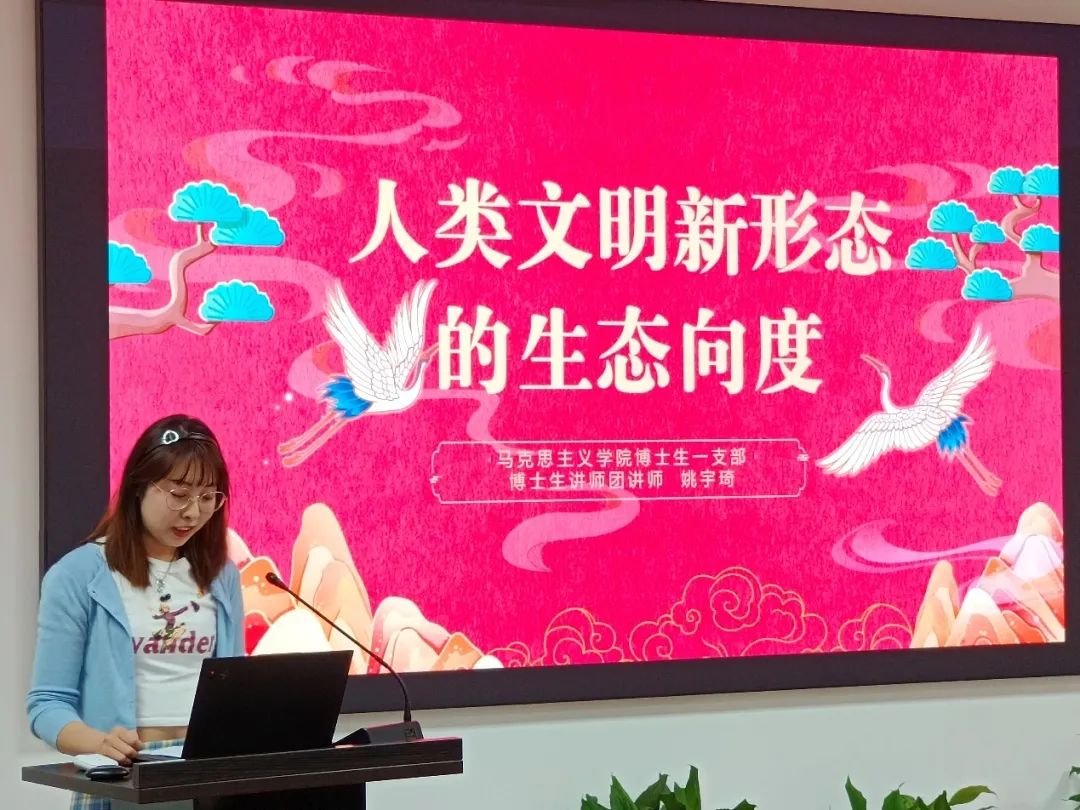 2022级博士生、博士生讲师团讲师姚宇琦同学为大家带来了题为“人类文明新形态的生态向度”的主题分享。姚宇琦同学从人类文明新形态与生态的内在逻辑、基于生态维度的历史见域的文明演进、人类文明新形态进程中生态文明的创新探索和走向人类共同体等四个方面深入浅出地解读了人类文明形态与生态的关系、历史与实践基础及发展前途等理论问题,让大家听故事、学理论,不断深化青年党员对习近平生态文明思想的理解。