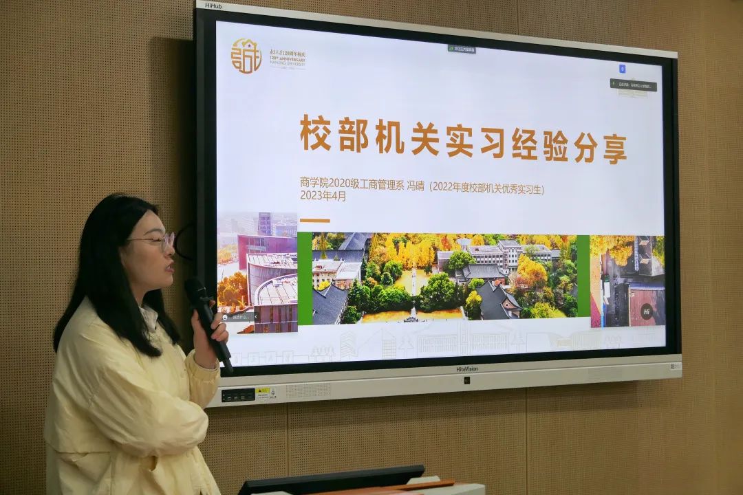冯晴同学的分享主要围绕实习计划宣介、实习经验分享以及实习心得感悟三个方面展开。首先,她对校部机关跟岗实习项目进行了概览性介绍。校部机关跟岗实习是学校去年首次开展的实习项目,为同学们体验机关工作氛围提供了宝贵机会。其次,她从选拔依据、选拔流程、工作内容等具体面向,系统详细地分享了个人实习经验。校部各部门在人员选拔时,对相关专业素养与优势经验有一定要求,同学们可以在报名表中将自身与之匹配的优势加以重点突出。项目选拔一般经过自主报名、院系盖章上交、学校资格复审、用人单位筛选报名表、面试等系列环节。此外,她具体介绍了在财务处计划管理科的职能工作。学校的计划管理科在财政计划与预算管理中担任承上启下的角色。最后,她以“心心相印,携手并进”为题分享了自身的心得感悟。一是坚持细心,二是保有耐心,三是培育恒心,四是保持虚心。