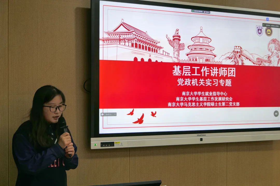 首先,由姜兴黔同学进行暑期党政机关实习项目介绍。校就业中心基层工作部、基层研究会与各地组织部门、人社部门及我校机关党委积极对接,着力打造暑期 “未来选调生”基层党政跟岗实习、“励学计划”党政实习、南大校部机关跟岗实习三大基层党政实习活动,充分服务和引导有意愿赴基层公共部门工作的优秀南大学子到基层参与实习实践活动。