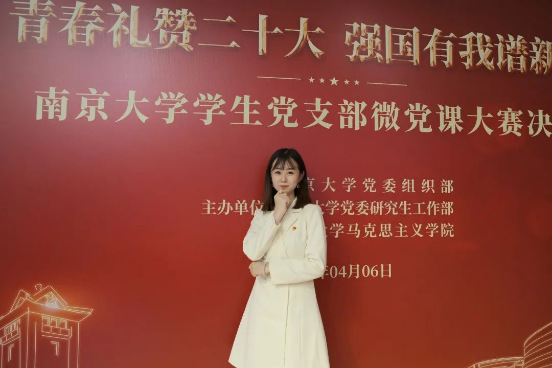 2021级硕士生第二党支部宣传委员、秉文书院党建助理,曾任校团委宣传与新媒体工作部挂职副部长。她参与组织党日活动10余场,推送总浏览量4000+;“南大青年”公众号参与审核、采访、撰写稿件20余篇,总浏览量2.1w+。积极参与各类比赛、社会实践及志愿服务活动,担任天堂镇兼职团委副书记、扬州市税务局实习生,曾获秉文书院微党课大赛一等奖、最佳人气奖等。