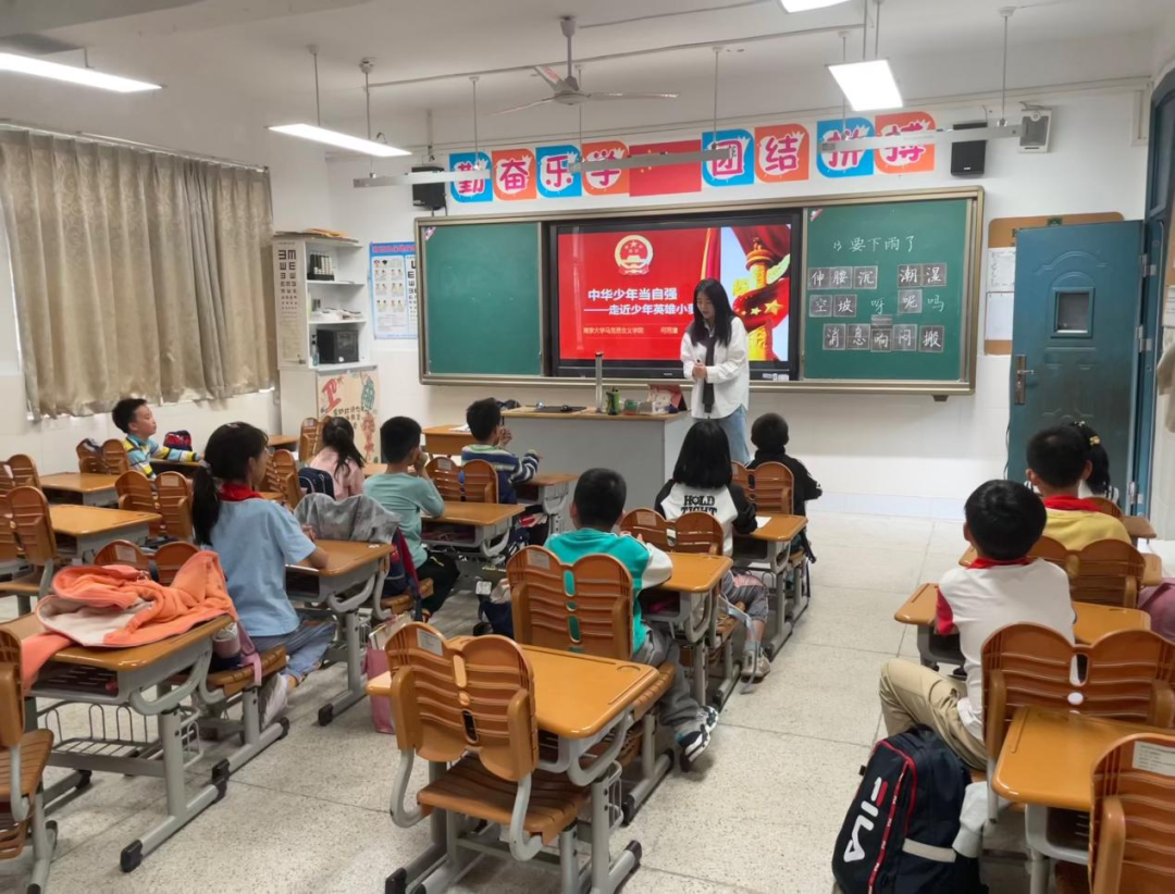 附属小学。马克思主义中国化研究专业2022级硕士生何雨潼、毛婉婷两位同学带来了以《中华少年当自强》和《真理的味道香又甜》为题的精彩宣讲。用志愿服务点亮小朋友们的心灵之灯,用红色故事点缀小朋友们的童年时光。