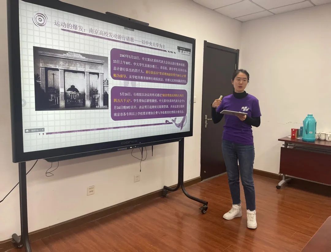 主讲人邓茹菲以“浪漫之名”提出了“五二〇”这个日子,告诉同学们“五二〇”不仅仅是“我爱你”的谐音,同时还是一群青年学子献给祖国母亲的深情告白,由此引入,邓茹菲介绍了“五二〇运动”发生的背景和运动的整体过程。在带领同学们了解了“五二〇运动”的基本过程后,邓茹菲向同学们重点阐释了此次运动的意义,总结概括了“五二〇运动”对于击败国民党反动派统治,推动国家、民族和人民的团结的十分重要的作用。