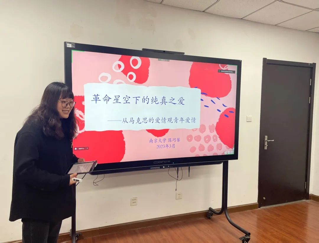主讲人陈巧馨首先向同学们简单介绍了马克思和燕妮,在叙述了两人相识相知相恋相爱的过程后,陈巧馨带领同学们从自然属性和社会属性两个层面对马克思的爱情观进行了分析,告诉同学们要辩证地看待物质经济条件和恋爱感情之间的关系,同时她强调爱情的延续更多的在于两个人在精神世界的契合,要在彼此相互尊重和平等的关系中,收获彼此的成长。