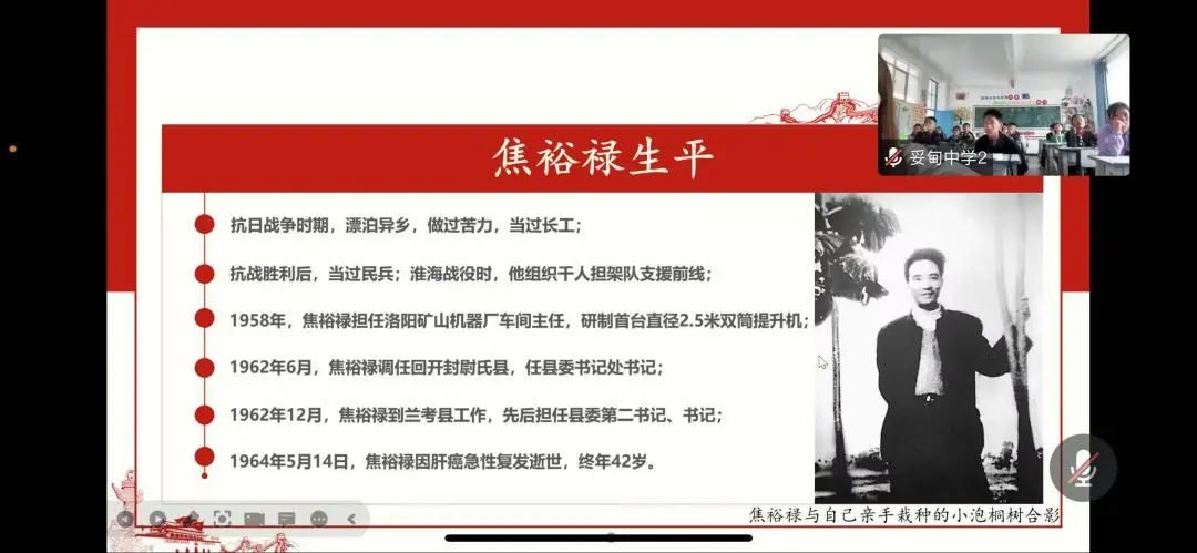 中的“焦桐”引出课程主题,带领大家回到“战风沙”的岁月。由此引入,王心雨介绍了上个世纪兰考的情况和焦裕禄同志在兰考的先进事迹。在兰考的475天中,焦裕禄同志始终和老百姓一起奋战,排内涝、战风沙、治盐碱,总结出了整治“三害”的具体策略,探索出了大规模栽种泡桐的办法,为兰考后续的治理和发展打下了坚实的基础。