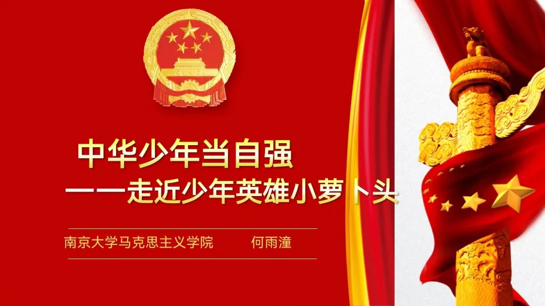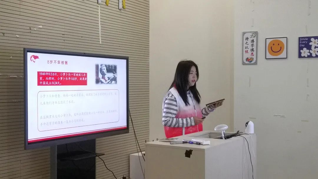 何雨潼讲师从小萝卜头是谁、为什么叫小萝卜头、小萝卜头做了什么三个方面为同学们全方位介绍了这位少年英雄的英勇事迹。小萝卜头在阴暗的牢房里长大,仍勤奋学习立壮志;面对敌人的糖衣炮弹,仍明晰善恶知荣辱。何雨潼用生动形象的语言为同学们勾勒出小萝卜头聪明伶俐、勇敢谨慎的模样,并通过一段视频,让同学们和小萝卜头进行了一场时空对话,小萝卜头信念坚定、心怀理想的形象给同学们留下深刻印象。最后,何雨潼激励同学们以小萝卜头为榜样,以信仰之魂凝聚精气神,做一名自立自强的中华少年。