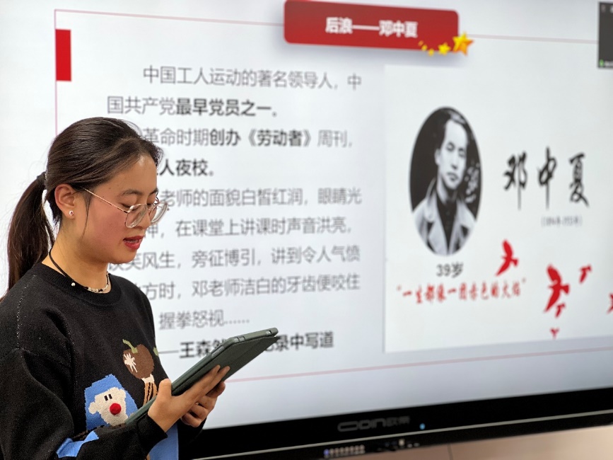 以此为引,沙小梅带领同学们回看了100年前的后浪在水深火热的时代里是如何肩扛责任、坚定前行的:吴光浩创造出昼伏夜动、远袭近止、声东击西、绕南进北的游击战术——100年前的后浪是非凡才智,卓越胆识;蔡碧珩高呼“共产党万岁”、“妇女解放万岁”等口号,从容就死——100年前的后浪是巾帼玫瑰,不让须眉;郭庠生一边抗战,一边创造抗日救亡的漫画、国画,——100年前的后浪是能文能武,发挥专长;邓中夏刻苦的学习精神和严谨的治学态度成就了一位无产阶级革命家和优秀学者——后浪是谦卑苦读,博览群书;诺尔曼·白求恩率领医疗队支援中国人民的正义斗争,对同志、对人民的极端热忱——后浪是心有大爱,超越国别。
