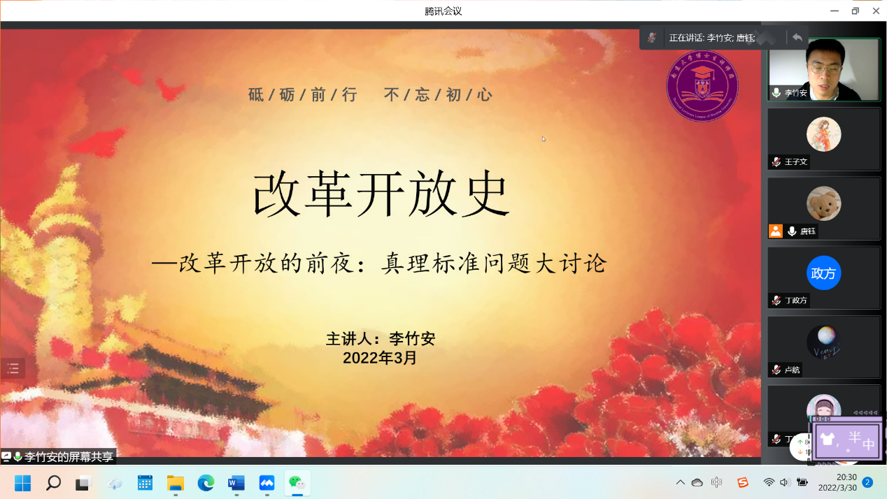 21级硕士研究生第一党支部邀请博士生讲师团讲师李竹安共同开设“党史校史小课堂”,学习科学家精神,迎接百廿校庆,跟随南京大学胡福明教授的脚步,围绕“关于真理标准问题大讨论”开展线上党日活动,活动由杏彩体育官网