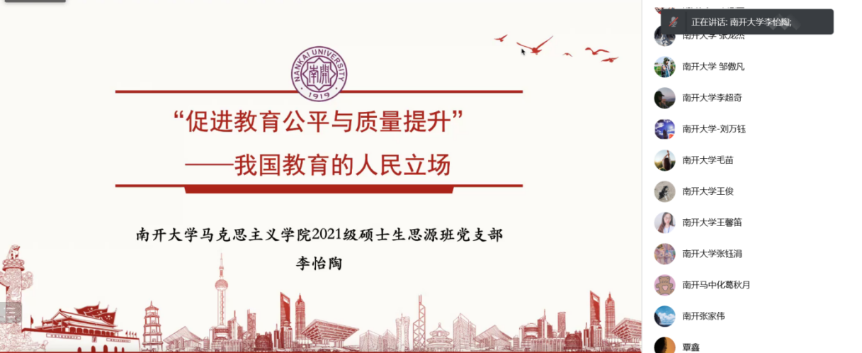 2021级硕士生思源班党支部书记王馨笛同志江道支部建设经验时,归纳为理论与专业结合、知识与竞赛活动结合、支部建设与学校党建工程结合,在交流和学习中贯彻“允公允能”的南开精神。