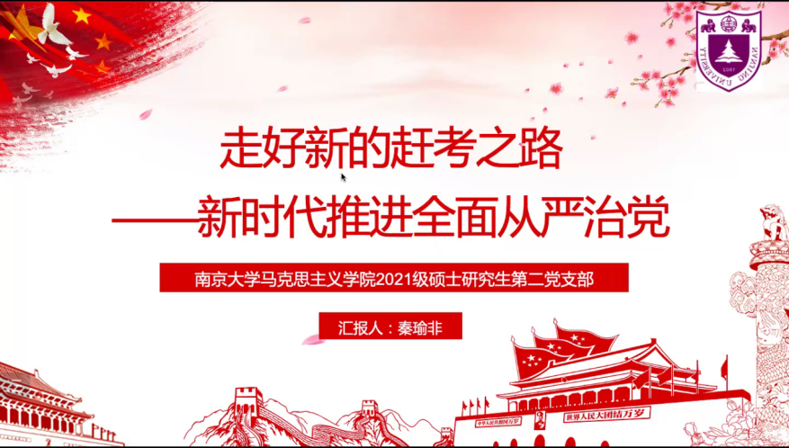 2021级硕士生第二党支部的秦瑜非同志,她分享的是“走好新的赶考之路——新时代推进全面从严治党”,由“从严治党”的形成与新时代“从严治党”的实践出发,阐释两会“从严治党”的重要意义。
