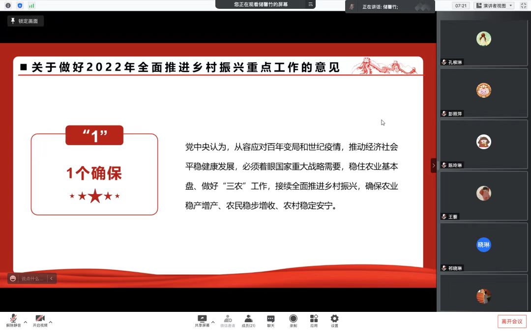 在共同学习环节,储馨竹同志围绕《中共中央国务院关于做好2022年全面推进乡村振兴重点工作的意见》进行解读,向大家介绍乡村振兴政策的背景。