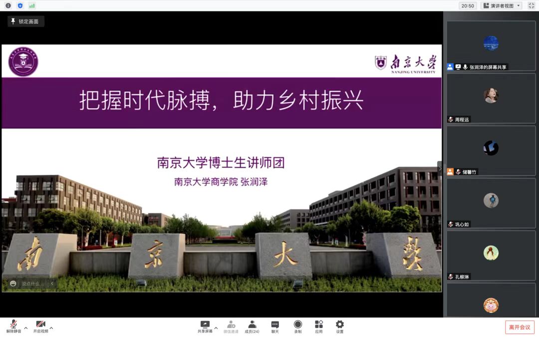 2020级硕士生第一党支部书记储馨竹主持,南京大学博士生讲师团讲师张润泽作为特邀嘉宾带来了关于“继往开来:把握时代脉搏,助力乡村振兴”的党课宣讲。