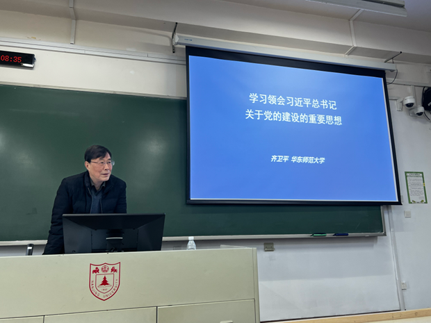 暨中共党史党建研究院聂平平教授担任主持人,聂平平老师向与会师生介绍了齐教授的学术履历与专业背景。齐教授是华东师范大学终身教授,博士生导师,新疆师范大学特聘教授,享受国务院特殊津贴专家,在中共党史党建、当代中国政治和政党制度研究等领域取得令人瞩目的研究成果,享有声誉。齐教授本次报告的题目为:“学习领会习近平总书记关于党的建设的重要思想”。